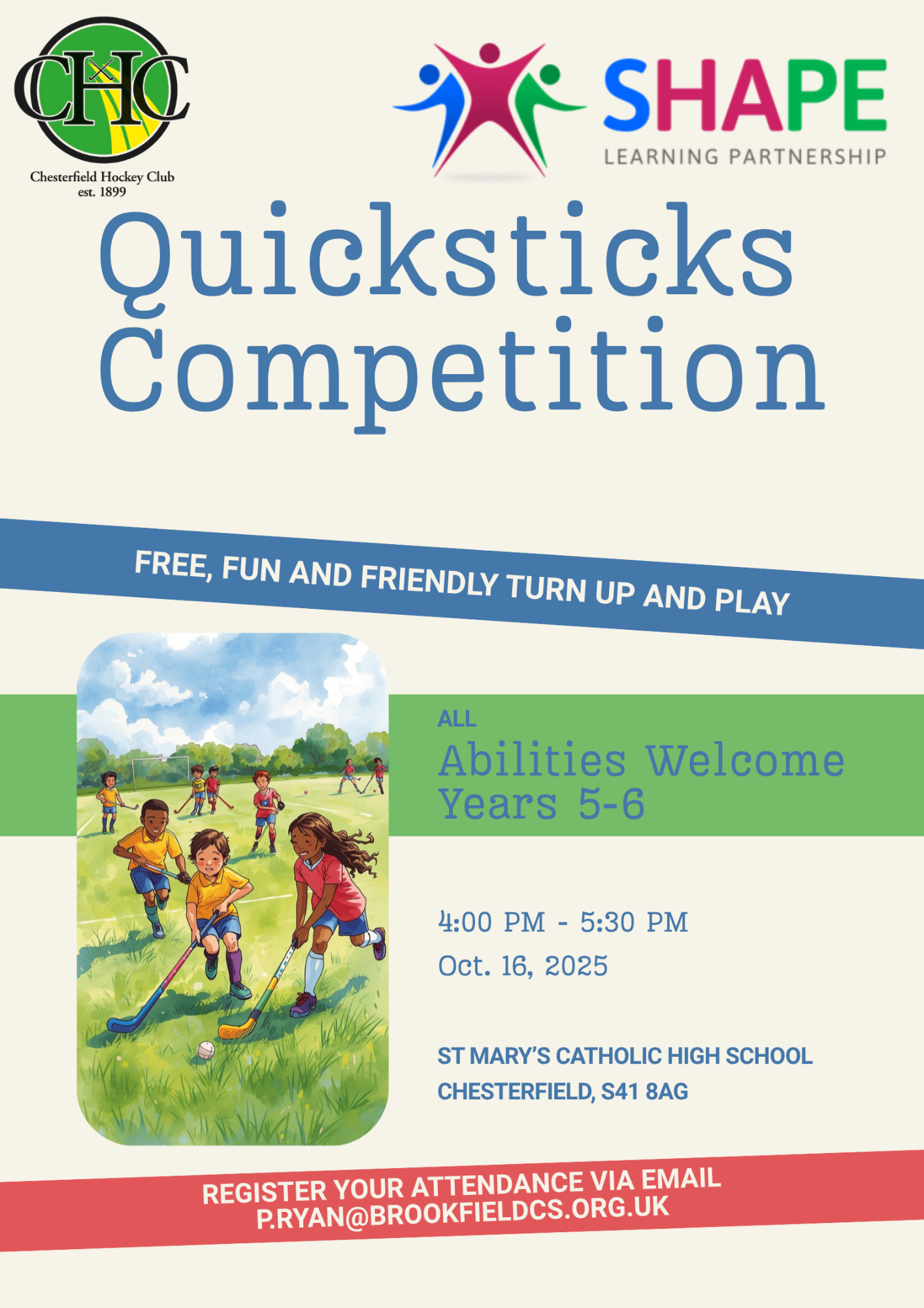 Can you share this poster with parents via your usual platforms. We have opened up our Y5-6 hockey quicksticks competition (this Thursday) to parents if they want to bring their child along. It’s not too late if you want to arrange to bring a team. We will be playing some friendly informal 4v4 games and the coaches will be on hand to help and support the children learn the rules and play successfully.